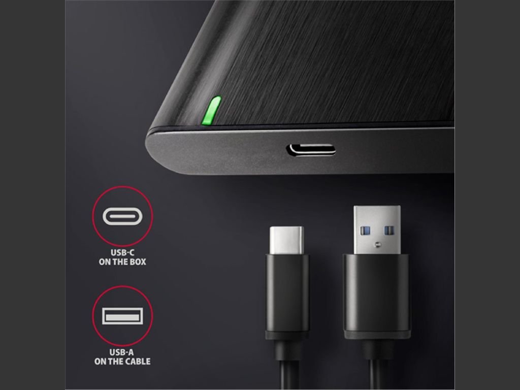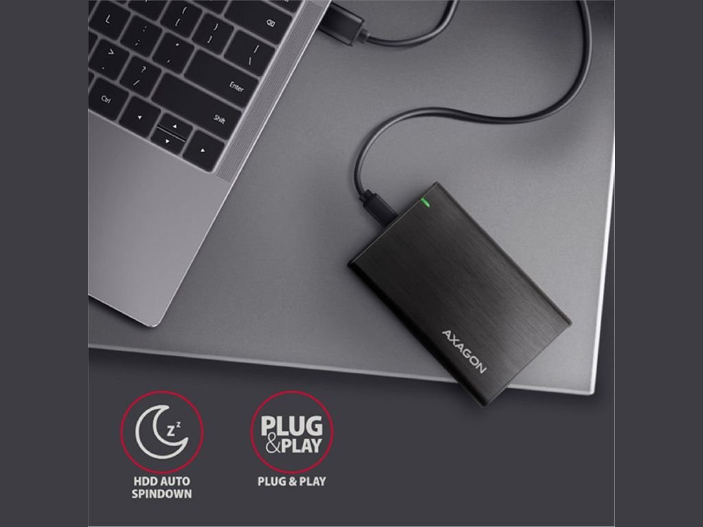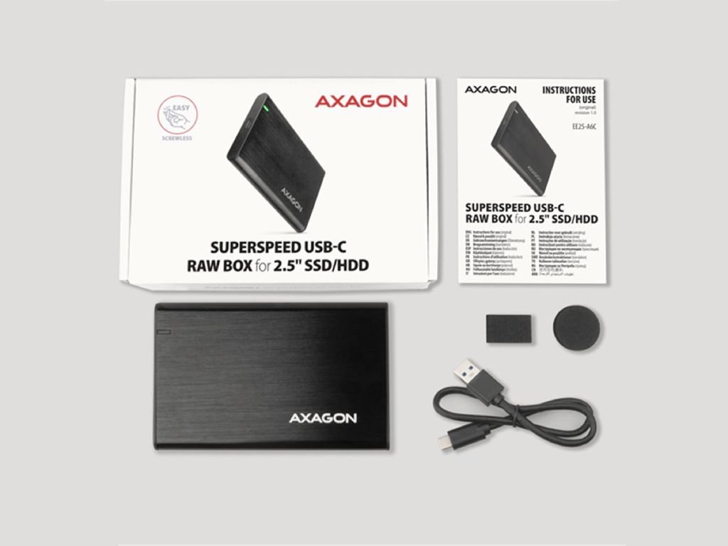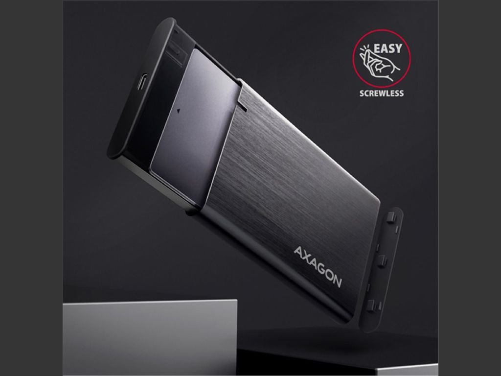 Elegantní hliníkové tělo RAW boxu AXAGON EE25-A6C nabízí bezšroubkovou montáž, takže výměna nebo vložení 2,5″ SSD či HDD je otázkou okamžiku – bez nářadí. Design s jemně kartáčovaným povrchem navíc odolává nežádoucím otiskům prstů.